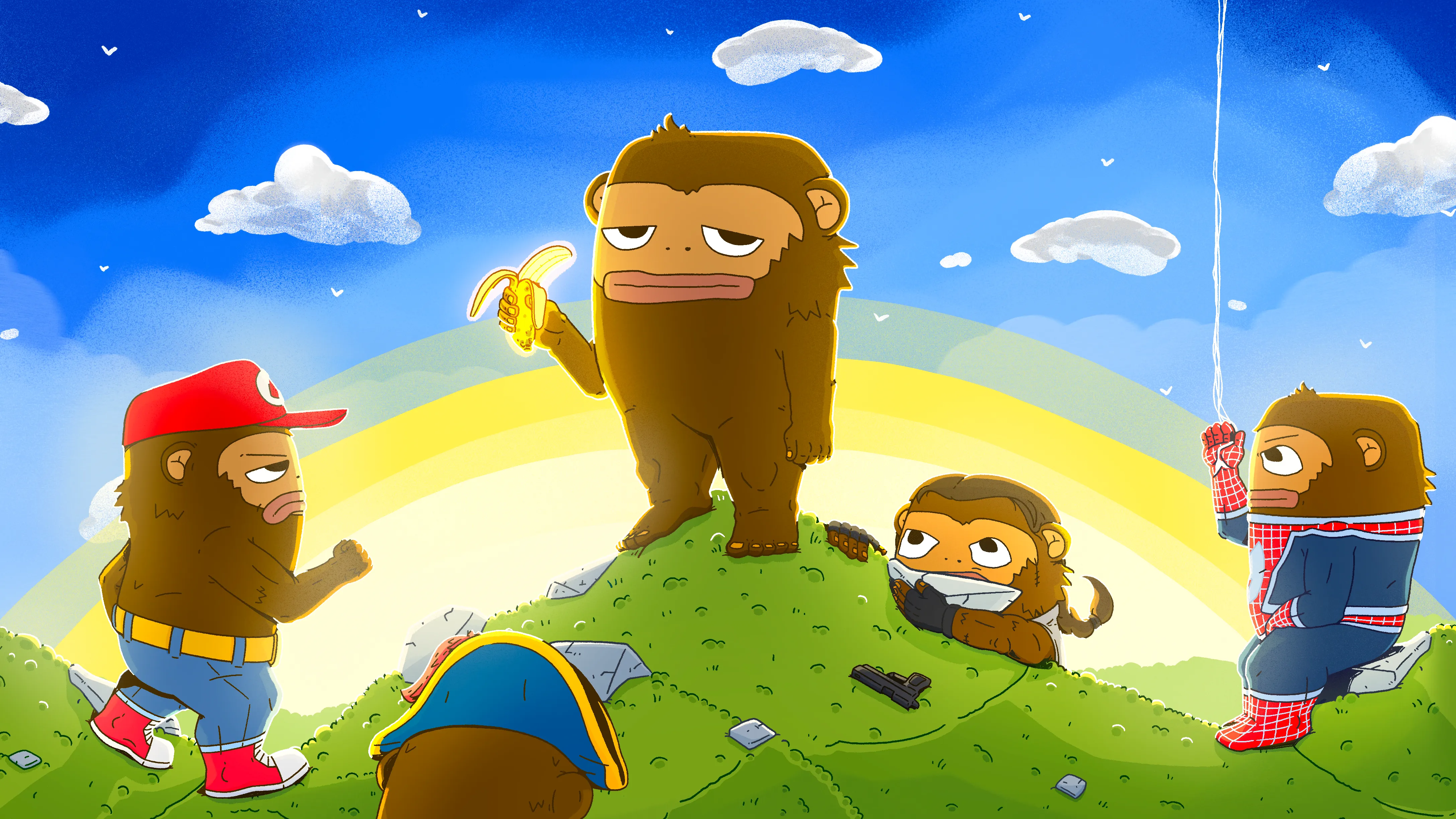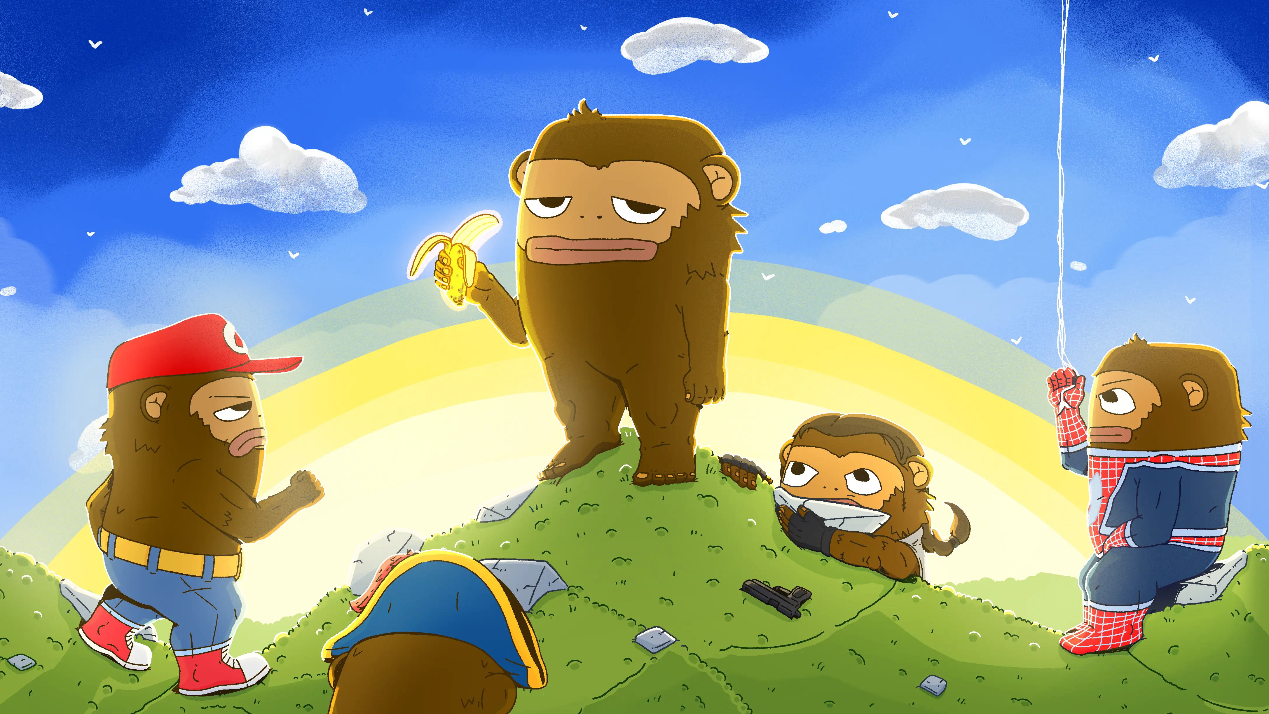 Monkees were first spotted in the Apechain jungle, swinging in with pure chaos and carefree energy. The tribe grew, the vibes stayed loose, and in time the Monkees ventured onward to Ethereum. Monkees is all about fun first. No stiff energy, no boring nonsense. Just 2001 handdrawn Monkees, launched in 2024 and here forever. Expect memes, music, minigames, and a tribe that never stops swinging.